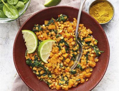4. Inzwischen den Spinat verlesen, waschen und trockenschleudern, dabei grobe Stiele entfernen. Nach der Garzeit den Spinat unter das Linsencurry rühren und darin 2 bis 3 Minuten garen, bis er zusammengefallen ist. Das Curry mit Salz und dem übrigen Currypulver (½ TL) würzen. Danach in Schalen oder tiefen Tellern anrichten und je 1 Limettenspalte dazu servieren.
