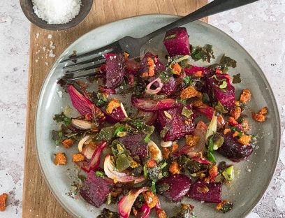 5. Randen aus dem Ofen nehmen, in die Schüssel geben und kurz alles vermischen. Bei Bedarf mit Salz und Pfeffer abschmecken. Sofort servieren.