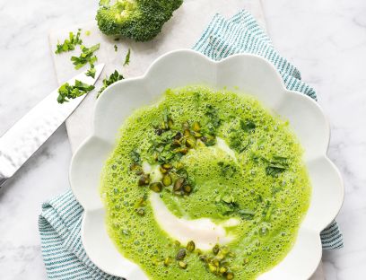 5. Die Suppe in Schalen oder tiefen Tellern anrichten, je 1 EL Mandeljoghurt daraufgeben und mit einem Löffelstiel verziehen. Mit den gehackten Pistazien und dem Selleriegrün garnieren.
